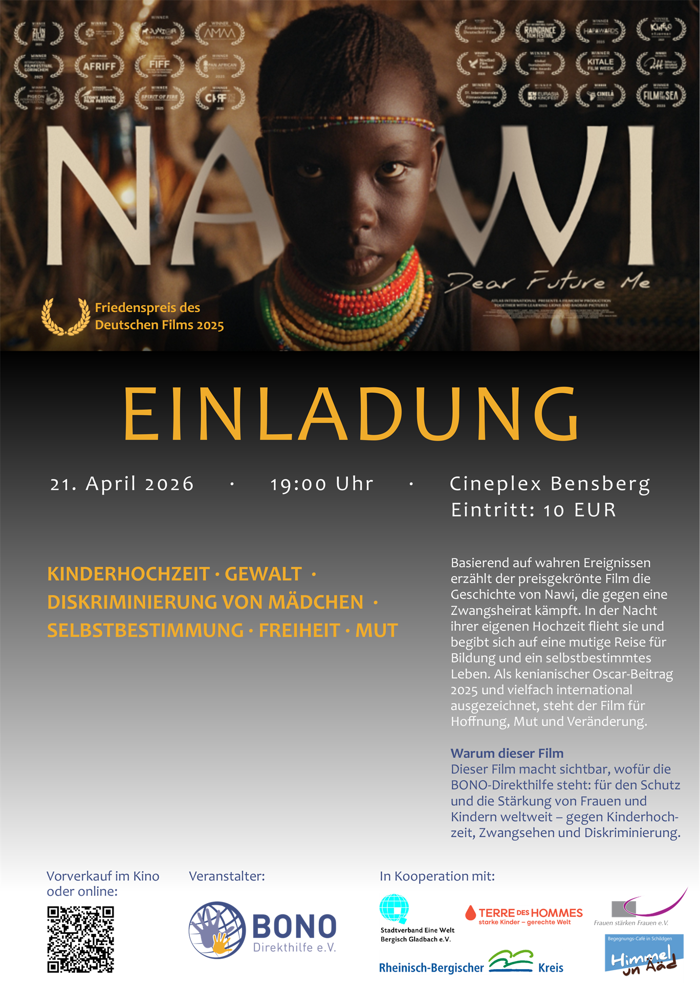 Der auf wahren Ereignissen basierende Film erzählt die Geschichte des kenianischen Mädchens Nawi, das sich mutig gegen eine Zwangsheirat stellt und für Bildung, Selbstbestimmung und Freiheit kämpft. Als preisgekrönter Film und Gewinner des Friedenspreises des Deutschen Films 2025 steht NAWI für Hoffnung, Mut und Veränderung – Werte, die auch im Mittelpunkt unserer Arbeit stehen.