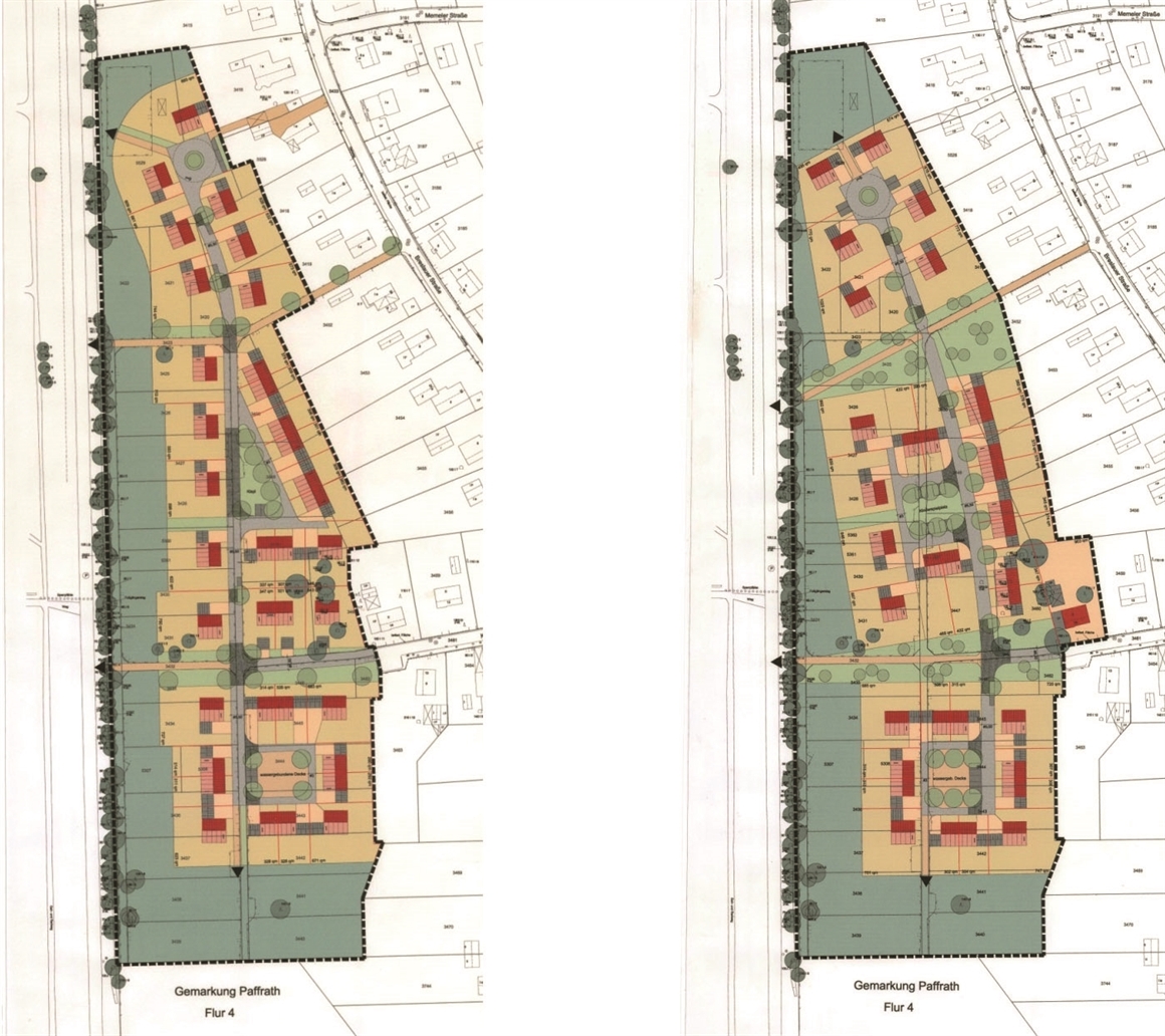 Das Planverfahren beginnt mit der Entwicklung der städtebaulichen Ziele für das Plangebiet. Sofern diese Ziele von den Darstellungen des Flächennutzungsplans (FNP) für das Plangebiet abweichen, muss auch der FNP geändert werden, weil – wie oben bereits dargelegt – die Inhalte des Bebauungsplans denen des Flächennutzungsplans nicht widersprechen dürfen. Im vorliegenden Fall „Breslauer Straße“ wurde die Darstellung „Grünfläche“ in „Wohnbaufläche“ geändert.