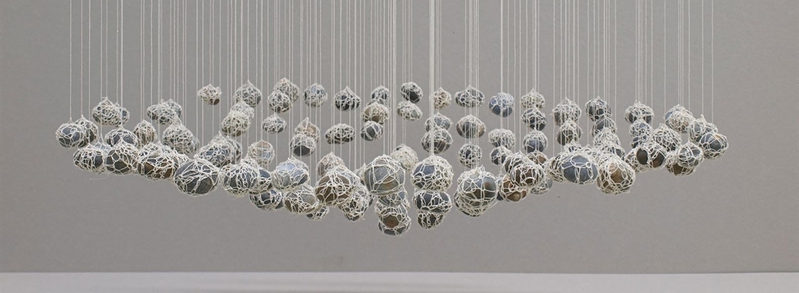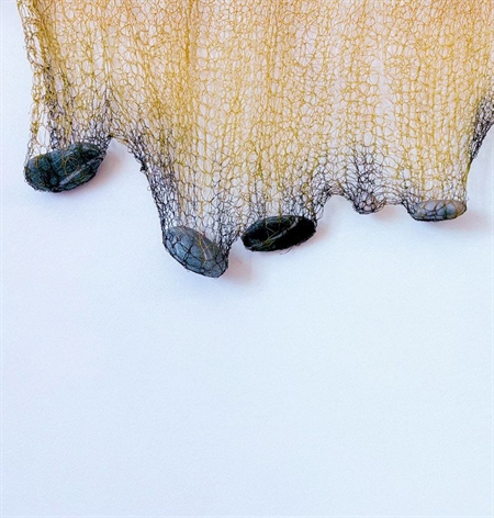 Zum Grund, 2025, Papiergarn, Kiesel, 20 × 60 cm, Courtesy the artist © the artist, Foto: Veronika Moos