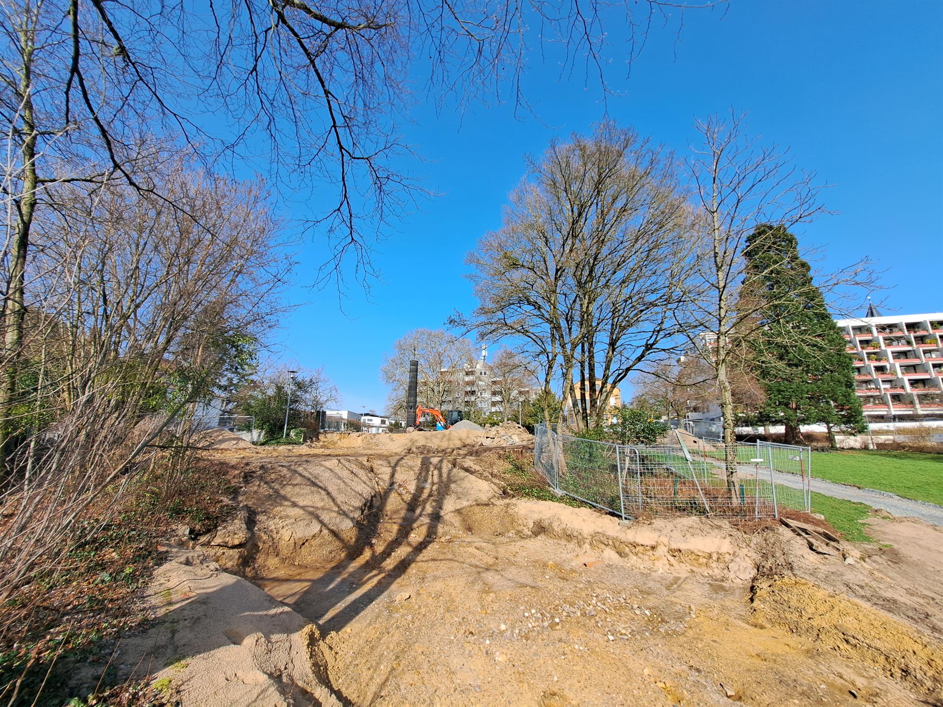 Die Fläche für den neuen Spielbereich (erster Bauabschnitt) und den angrenzenden Fußweg ist soweit vorbereitet, sodass hier nun erste Einbauten erfolgen können. Erste Spielgeräte sollen planmäßig im April aufgestellt werden.