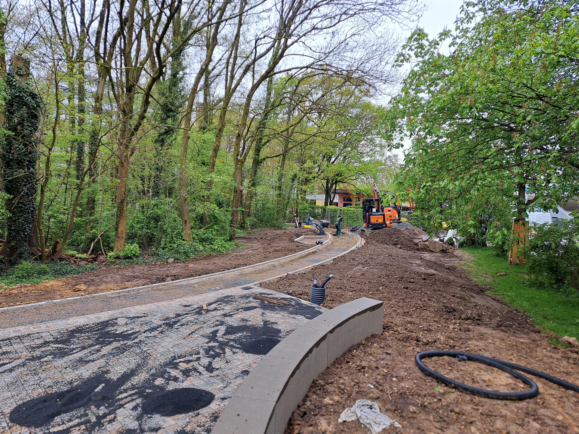 Nachdem die Erdarbeiten zu Beginn durch erschwerte Witterungsbedingungen etwas schleppend verliefen, sind die Wegebauarbeiten nun voll im Gange. In Teilen der Parkanlage sind bereits Einfassungen, Treppenstufen und Steinblöcke gesetzt. In den kommenden Wochen werden Platz- und Wegeflächen vollständig hergestellt, anschließend werden dann weitere Einbauten wie etwas Sitzelemente folgen.