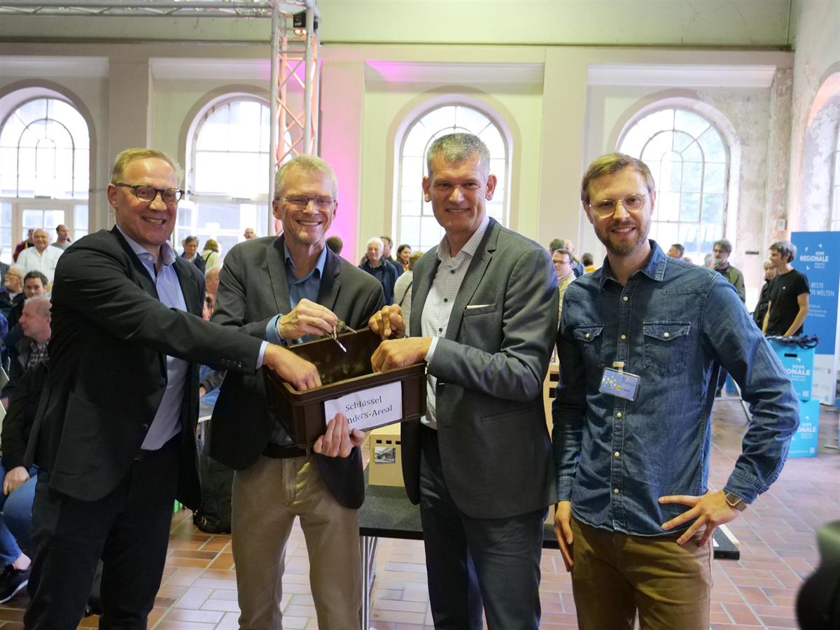 Symbolisch werden an diesem Tag dem Bürgermeister und der städtischen Projektgruppe die Schlüssel zum Zanders-Areal vom Insolvenzverwalter überreicht.