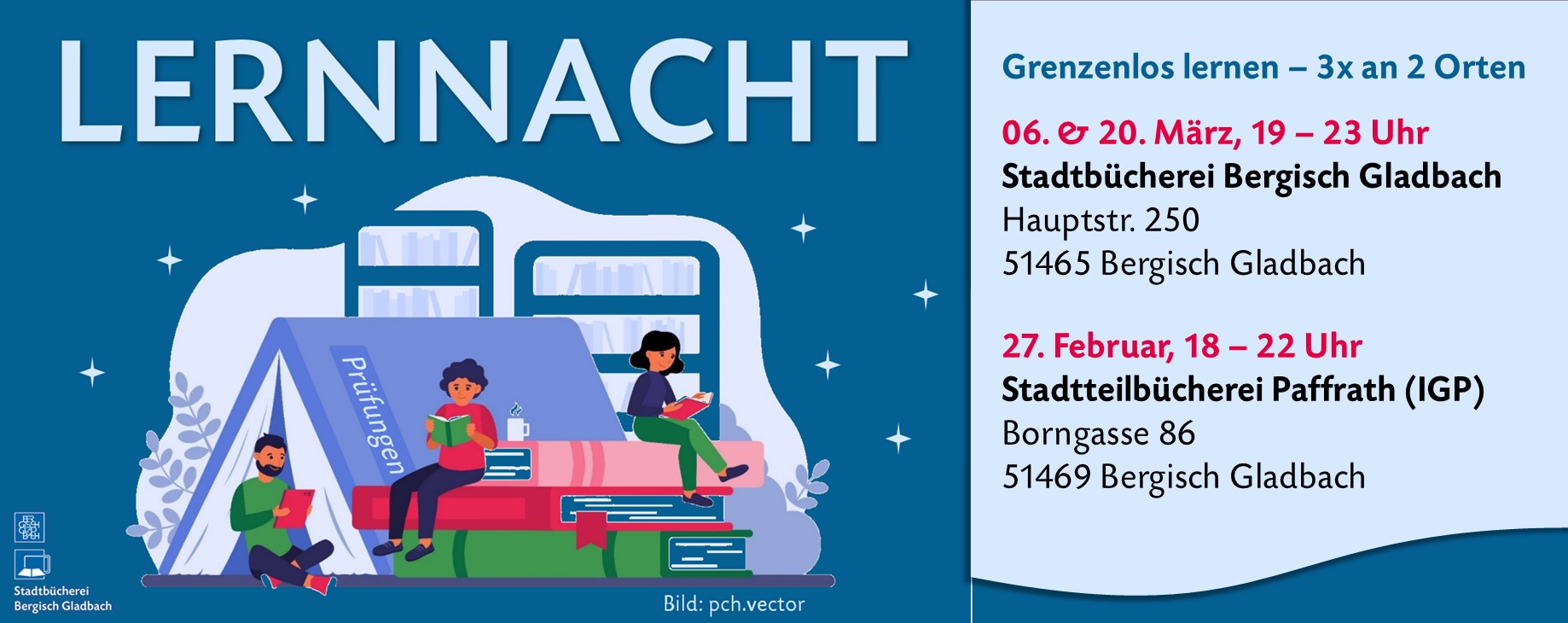 06. und 20. März in der Stadtbücherei Bergisch Gladbach (Stadtzentrum) und am 27. Februar 2026 in der Stadtteilbücherei Paffrath