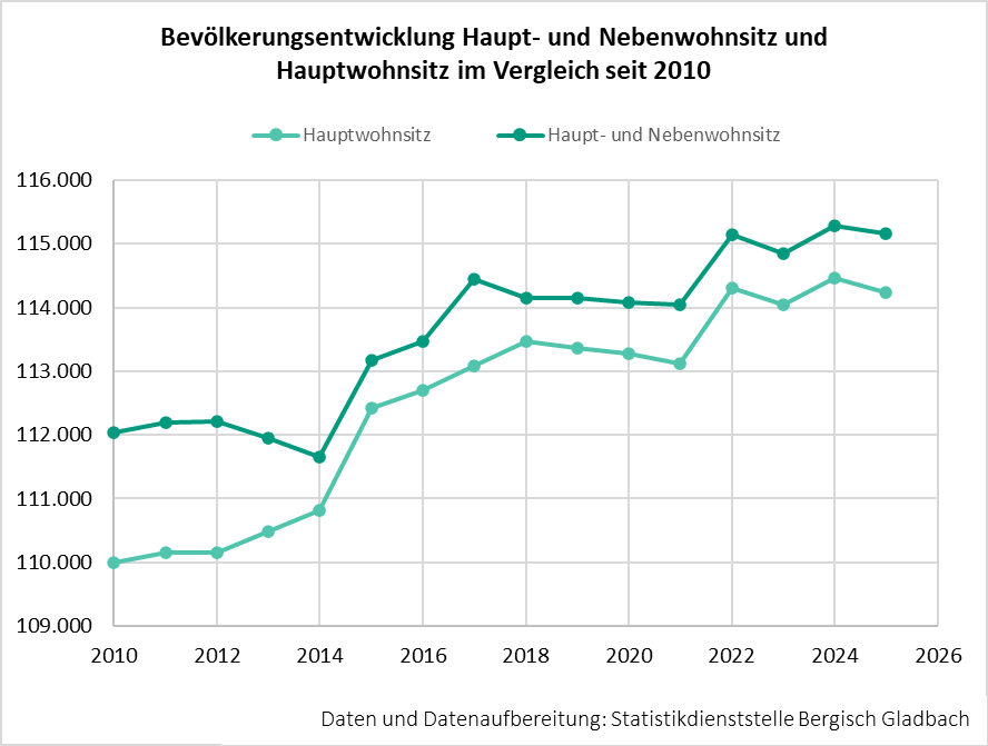 Rund 114.230 Einwohnerinnen und Einwohner lebten zum Stichtag 31.12.2025 in Bergisch Gladbach. Trotz phasenweiser Stagnation verzeichnet die Stadt seit 1975 ein stetiges Bevölkerungswachstum und ist damit auch die bevölkerungs-reichste Kommune des Rheinisch-Bergischen Kreises.